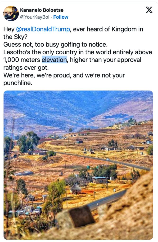 “Lesotho’s the only country in the world entirely above 1,000 meters elevation, higher than your approval ratings ever got,” he wrote, adding: “We’re here, we’re proud, and we’re not your punchline.”